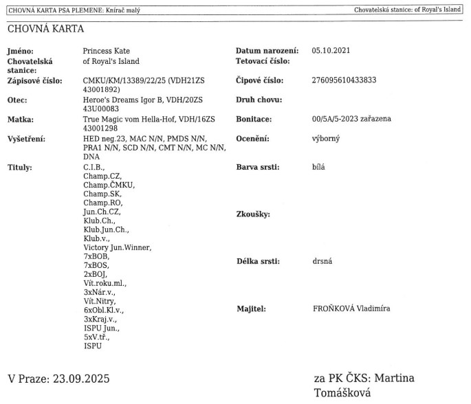 zařazena do chovu, bonitační kód 00/5A/5/23, výška 34 cm